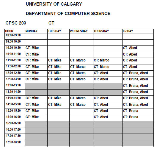 Teaching assistants are graduate students employed to help with marking and to staff the CT. You can of course still come by during the office hours of the course instructor. [James Tam schedule]