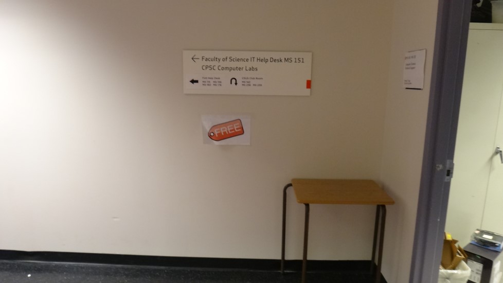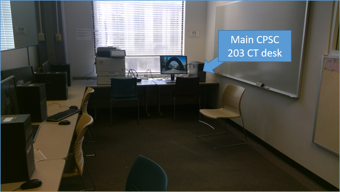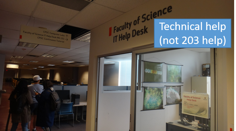 This is the help CT (Students in CPSC 203, 217, 231 and depending upon the semester it may also include CPSC 219 and 233 students so make sure you go the right desk. It's not staffed in the summer when these pictures were taken so there is no help signage posted)