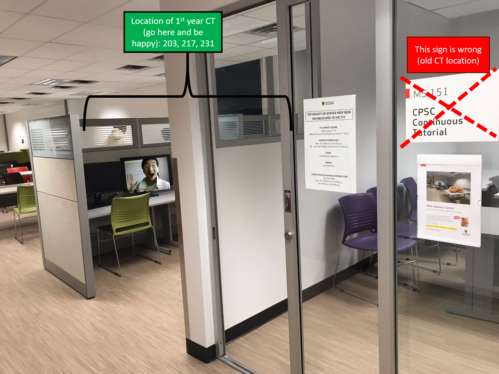 CT consists of question and answer sessions where you can go for help. The CT is located in the first floor computer sciences labs in Math Sciences (nearbut not inside MS151) at table/desk labeled "CPSC 217 CT" (or something similar). They are question and answer sessions to provide help so no new teaching will occur. You can go to the CT session of any Teaching Assistant and not just the one's where your TA is working.