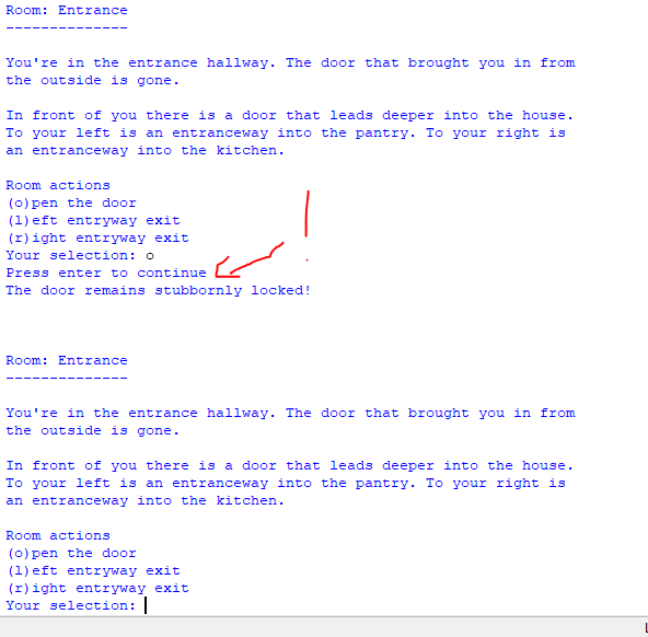The player cannot open the inner door until it has been unlocked. The player can freely pass through either entryway with no conditions. Entering a non-existent selection will result in a suitable helpful error message and the above options are displayed again. As long as the player remains in the room the program will repeatedly display the above menu options (using a loop) after the user enters a selection.