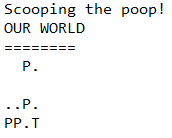 Augment the existing program so that it will ['clean'] the simulated world (4x4 list) of 'poop'. It will also [count] and display the number of occurrences of a user-specified string. Finally the user can specify the part of the world that will be included in the cleaning and the counting via [end point of the process]. For instance, the user can opt to only clean/count in the range from the first element (0,0) to the 2nd row and 3rd column (1,2). Any other instances outside that range will not be counted/cleaned. As you can see in the outline below the counting occurs before the cleaning.